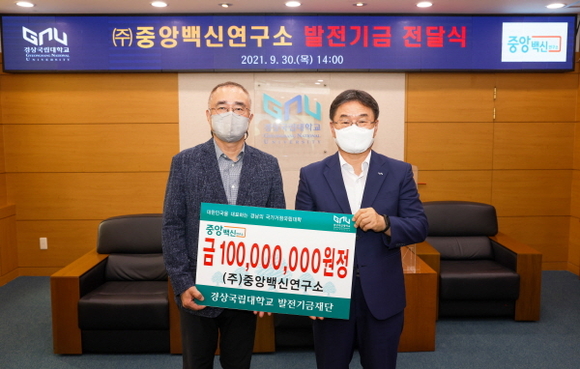 ㈜중앙백신연구소가 경상국립대학교(GNU) 발전기금 1억원을 출연했다. 발전기금의 절반은 수의과대학의 연구·실험·실습 등 경쟁력 향상을 위한 용도로 사용될 예정이다.