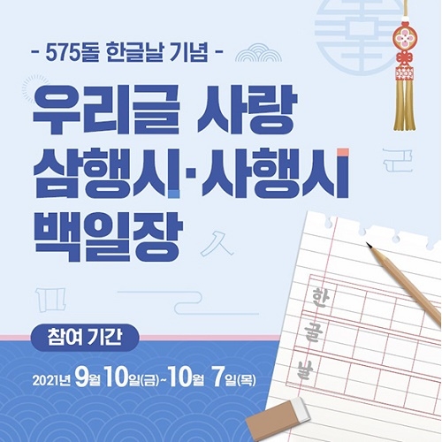우선 ‘우리글 사랑 삼행시·사행시 백일장’은 삼행시 또는 사행시 부문을 선택, 제시어 한글의 소중함을 담은 시를 써보는 공모전이다. 한글을 사랑하는 부산 시민이라면 누구나 신청서를 전자우편으로 10월 7일까지 제출하면 된다. 한 사람당 한 부문의 한 개 제시어만 참여 가능하다.