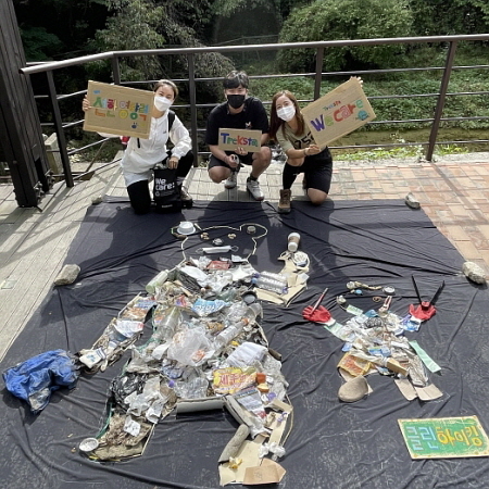 ‘We Care’ 에코 캠페인 참여자들이 정크아트를 만든 뒤 인증샷을 찍고 있다. (사진=트렉스타 제공)