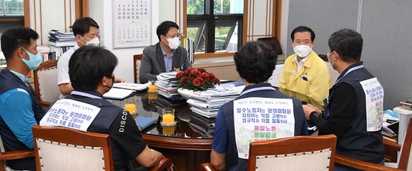 구인모 거창군수는 지난 30일 환경미화원 노동조합인 민주노총 일반노조 희봉위생공사 지회장 이하 노조 간부들과 소통군수실을 열어 현장에서 겪는 환경미화원의 고충과 애로사항을 청취했다.