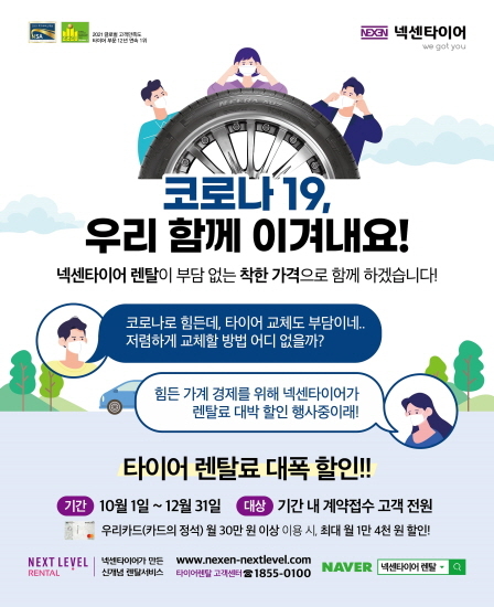 넥센타이어가 전 국민의 ‘코로나19’ 극복을 응원하고자 타이어 렌탈 서비스인 ‘넥스트레벨 렌탈’ 할인 이벤트를 실시한다고 5일 밝혔다.