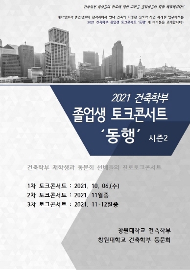 창원대학교는 건축학부는 재학생과 동문회가 함께 하는 ‘2021 건축학부 졸업생 토크콘서트’를 개최한다고 5일 밝혔다.