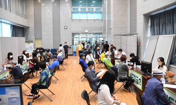 국민지원금의 신청 유형별 지급내용은 온라인 신용·체크카드 3만 2124명(58.8%), 제로페이 충전 480명(0.9%), 오프라인 선불카드가 2만 2009명(40.3%)을 차지한다.