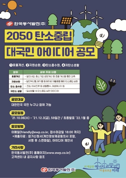 한국동서발전이 기후위기 인식을 확산하고 온실가스 저감방안을 발굴하기 위해 ‘2050 탄소중립 대국민 아이디어 공모’를 시행한다고 6일 밝혔다.