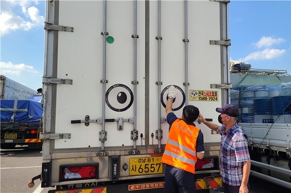 한국도로공사 부산경남본부는 지난 5일 진영휴게소(순천방향)에서 화물자동차공제조합 경남지부와 합동으로 화물차 사고예방을 위해 대대적인 '잠깨우는 왕눈이' 반사지 부착 캠페인을 전개했다.
