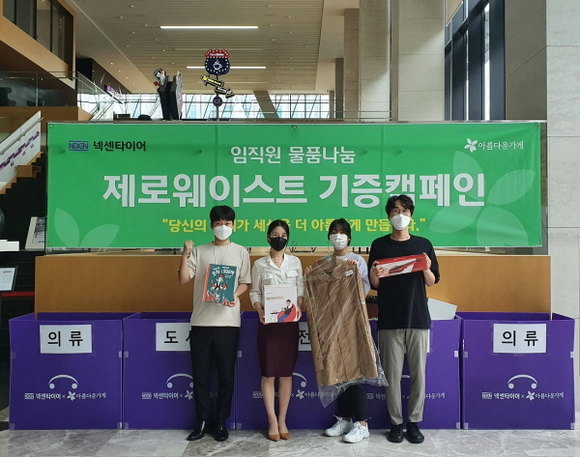 넥센타이어는 모든 제품이 재사용될 수 있도록 장려하고 환경오염을 줄여 지속가능한 사회를 만드는 데 기여하고자 ‘제로웨이스트’ 캠페인을 마련했다. 임직원을 대상으로 의류, 책, 가전제품 등 재활용이 가능한 물품을 기증받았다.