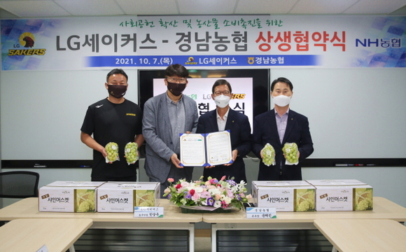 경남농협은 7일 창원실내체육관에서 프로농구단 LG세이커스와 ‘사회공헌 확산 및 지역 농산물 소비 촉진을 위한 상호협력 협약식’을 가지고 농업·농촌 및 지역사회 발전을 위해 지속 협력해 나갈 것을 약속했다.