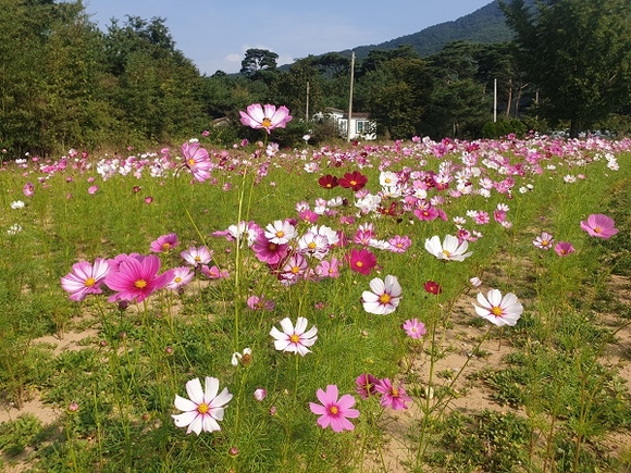 경남 밀양시 산외면 남기리 835번지 일원에 해바라기 꽃단지와 함께 코스모스가 가을의 시작을 알리고 있다. 10월 선선한 가을바람을 맞으며 개화하기 시작한 코스모스는 해바라기와 잘 어우러져 시민들의 감성을 자극하고 있다. (사진=밀양시 제공)