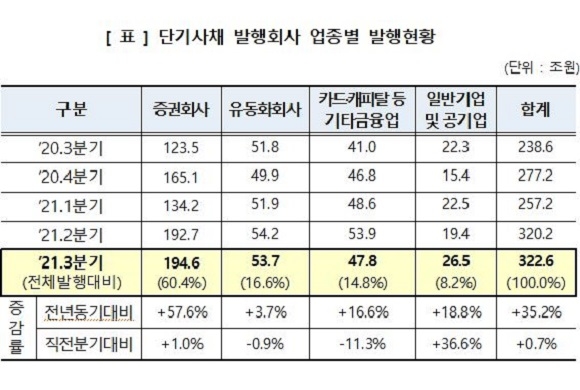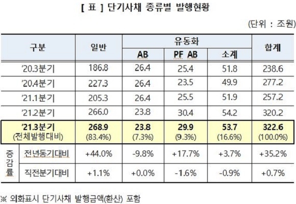종류별로 일반 단기사채는 268조 9000억원이 발행돼 전년동기 대비 44.0%(186조 8000억원) 늘었으며 직전분기와 비교하면 1.1%(2조 9000억원) 증가했다.