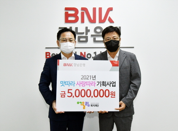 BNK경남은행이 12일 어울림복지재단에 ‘맛따라 사랑따라 기획사업 기금’을 기탁했다.