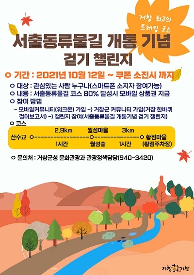이번 행사는 거창군 보건소 걷기행사 '거창한바퀴 걸어보고서'와 연계해 시행되며, 서출동류물길 5.9km 중 80%이상을 달성하면 선착순 400명에게 8천원 상당의 모바일 상품권을 지급한다.