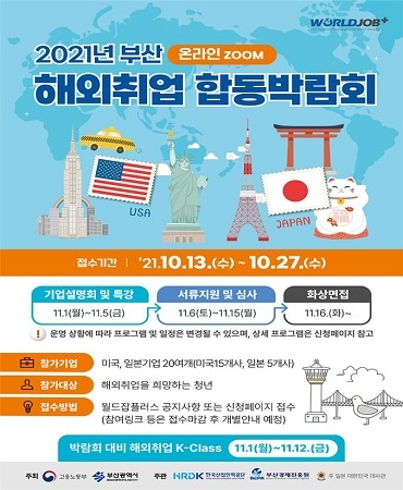 부산경제진흥원과 부산시가 지역 청년의 글로벌 취업 진출을 돕기 위해 ‘2021 부산 해외취업 합동 박람회’를 온라인으로 개최한다고 13일 밝혔다.