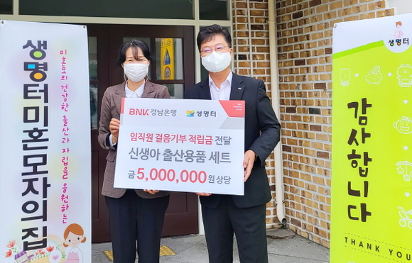 BNK경남은행은 13일 생명터 미혼모자의 집에 ‘신생아 출산용품 세트’를 기탁했다.