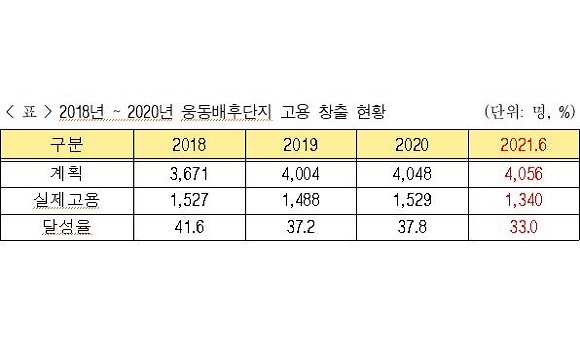 웅동 배후단지 내 일자리 고용 또한 부진한 것으로 확인됐다. 웅동 배후단지의 지난해 고용 창출 목표는 총 4048명이었으나 실제 고용은 1529명으로 목표 달성률이 38%에 그쳤다.
