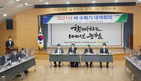 경남농협은 13일 경남지역본부 회의실에서 RPC운영 부·울·경협의회 소속 조합장과 농식품부 김정주 과장, 농협경제지주 양곡부 백형일 단장 등이 참석한 가운데 ‘2021년 벼 수확기 대책회의’를 가졌다.