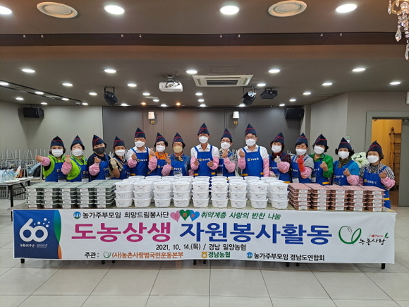 이날 행사에는 윤해진 경남농협 본부장, 손영희 농협 밀양시지부장, 이성수 밀양농협 조합장, 최민련 농가주부모임 경남도연합회 회장 등 20여 명이 참석했다. 이들은 우리 농축산물을 활용한 밑반찬 3종 세트(배추김치, 돈육불고기, 멸치꽈리볶음)를 만들고 150여 가정에 전달했다.