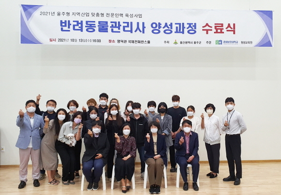 춘해보건대학교 평생교육원은 지난 13일 명덕관 국제컨퍼런스홀에서 2021년 울주형 지역산업 맞춤형 전문인력 육성사업 ‘반려동물관리사 양성과정’ 수료식을 가졌다.