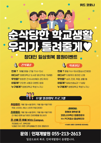 창원대학교는 정부의 단계적 일상회복, ‘위드 코로나’ 정책 방향에 맞춰 대학생들의 일상회복을 지원하고 응원하는 다양한 프로그램을 시행한다고 14일 밝혔다.