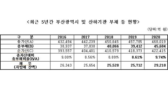 부산시의 부채 현황은 서병수 전 시장 시절인 2017년에는 3조 7838억원이며 오거돈 전 시장 시절인 2018년에는 4조 66억원으로 늘었으며 지난해에는 4조 5604억원에 달한 것으로 조사됐다. 이에 총자산 대비 부채비율도 지난 2019년 8.61%에서 지난해 9.74%로 증가했다.