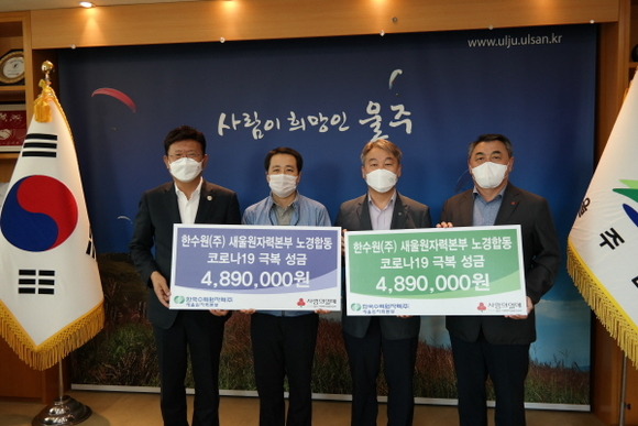 한국수력원자력 새울원자력본부는 15일 울주군청에서 사회적 책임을 다하는 ESG 경영가치의 실천을 위해 노경합동으로 임직원들이 자발적으로 모금한 코로나19 극복 ‘울주愛 성금’ 전달식을 가졌다.
