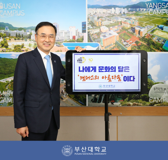 부산대학교 차정인 총장이 지난 15일 ‘2021년 문화의 달 챌린지’ 캠페인에 참여해 ‘대한민국 문화의 달’ 50주년을 축하하고, ‘2021년 대한민국 문화의 달’ 행사를 응원했다.
