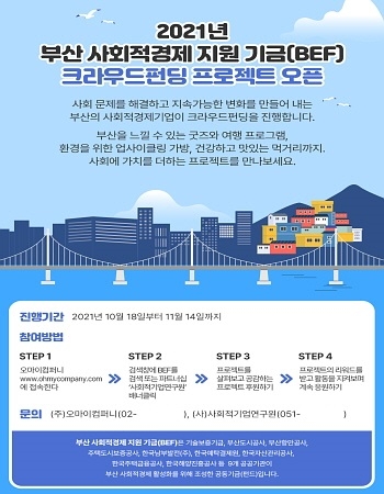 한국해양진흥공사, 한국남부발전, 기술보증기금(기보) 등 부산 소재 9개 공공기관이 ‘부산 사회적경제 지원기금(BEF)’을 활용해 ‘크라우드 펀딩’ 및 ‘온라인 프로모션’ 사업을 추진한다고 19일 밝혔다.