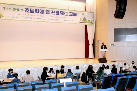 이날 1차로 명정초등학교(울산 중구 소재) 학생 25명이 5개 조로 편성돼 ‘에너지 정책 관련 초등학생 팀 프로젝트 교육’에 참여했다. 학생들은 울산광역시가 추진하는 신재생에너지 사업에 대해 조사·발표하고 토론과 질의응답 시간을 가졌다.