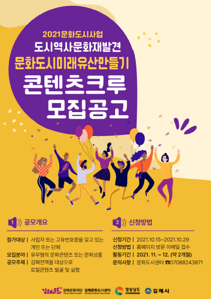 모집은 이달 15일부터 29일 오후 6시까지며, 서류심사 및 대면PT 심사 과정을 거쳐 11월 4일 최종 선발한다. 신청은 문화도시김해 홈페이지에서 지원서를 내려받아 작성한 후 메일로 접수하면 된다.