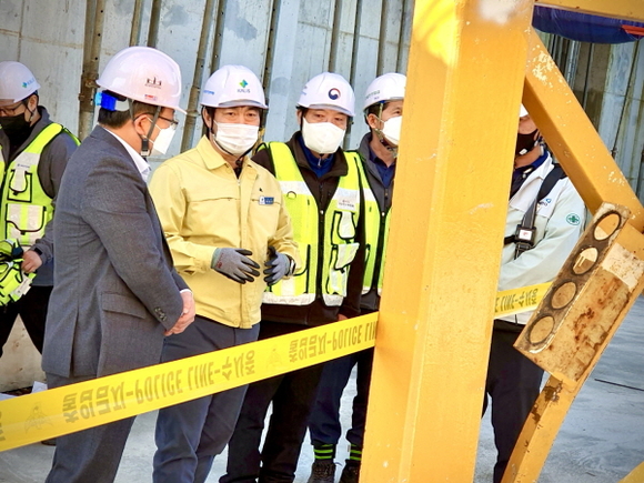 국토안전관리원 박영수 원장이 20일 타워크레인 설치 작업 중 근로자 사망사고가 발생한 경기도 남양주시 진접읍 아파트 신축현장을 방문해 안전실태를 점검했다.