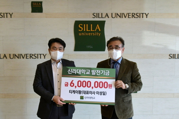 신라대학교는 티케이팜 이성일 대표가 후배들을 위해 발전기금 600만원을 전달했다고 밝혔다.