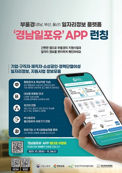 김일수 도 일자리경제과장은 “경남일포유를 통해 원하는 일자리 정보를 편하게 앱으로 확인해 활용할 수 있을 것으로 기대한다”며 “부·울·경 전체가 공유할 수 있는 시스템으로 함께 지역의 일자리 창출을 위해 노력하겠다”고 말했다.