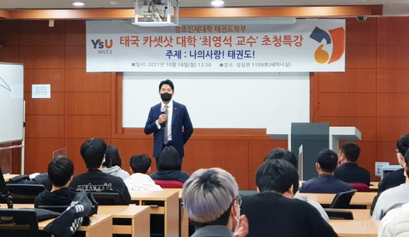 영산대학교 창조인재대학 태권도학과는 지난 18일 태국 국가대표팀 감독이자 태국 카셋삿대학교(KASETSART University) 최영석 교수를 초청해 ‘나의 사랑! 태권도’를 주제로 특강을 진행했다.