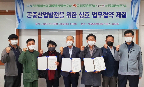경상국립대학교(GNU) 미래동물성자원연구소는 지난 20일 오후 1시 칠암캠퍼스 생명과학대학에서 곤충산업 경쟁력 강화를 위해 지리산곤충연구소·㈜FG&B부설 식용곤충연구소와 업무협약을 체결했다.