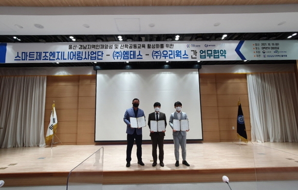 창원대학교 경상남도지역혁신플랫폼 스마트제조엔지니어링사업단은 대학본부 대회의실에서 ㈜엠테스, ㈜우리웍스와 ’울산·경남 지역인재양성 및 산학공동교육 활성화를 위한 상호교류 및 업무협력 협약식'을 개최했다고 21일 밝혔다.