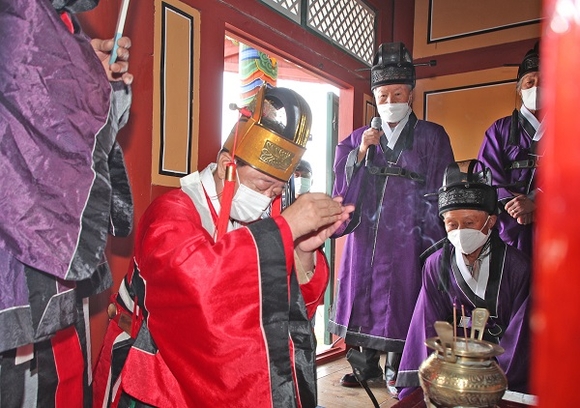 가락국 마지막왕인 제10대 구형왕(양왕)과 계화왕후를 기리는 덕양전 추향대제가 21일 산청군 금서면 덕양전에서 봉행됐다.