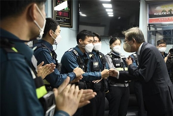 부산시는 지난 21일 ‘경찰의 날’ 76주년을 맞아 박형준 시장이 이날 오전 부산 남부경찰서 대연지구대를 방문해 일선 경찰관들을 격려했다고 22일 밝혔다.