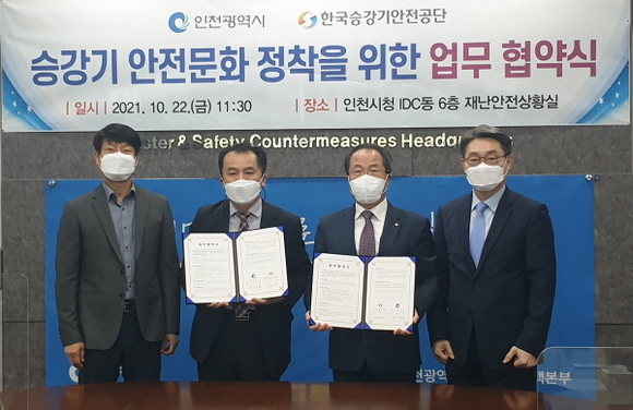 한국승강기안전공단과 인천광역시가 승강기 안전성 확보와 승강기 이용자 및 관리자의 안전의식 고취, 안전문화 정착을 위한 업무협약을 22일 인천시청에서 체결했다.