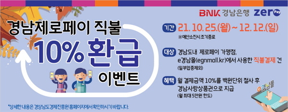 BNK경남은행은 오는 12월 12일까지 경상남도경제진흥원과 제휴를 맺고 ‘경남 제로페이 10% 페이백 이벤트’를 진행한다.