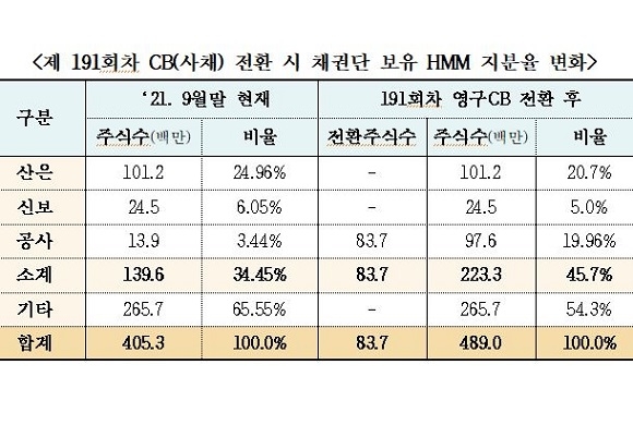특히 공사는 HMM을 공동 관리 중인 기관으로 기업 가치와 주식시장에 영향을 줄 수 있는 지분의 단기 매각은 자제하고 기존 보유주식과 전환될 주식에 대해 공매도 대차를 불허한다는 입장이다.
