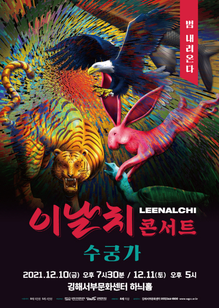 2020년 한국을 ‘범’의 해로 만들었던 ‘이날치’의 공연이 김해서부문화센터에서 펼쳐진다. 12월 10일과 11일 김해문화재단 김해서부문화센터에서 이날치 콘서트 ‘수궁가’를 감상할 수 있다.