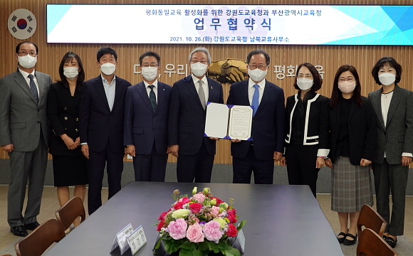 지난 26일 오전 강원도교육청 남북교류사무소에서 ‘부산시교육청-강원도교육청 평화 통일교육 교류 협약식’이 열린 가운데 (왼쪽 5번째부터)민병희 도교육감과 김석준 시교육감 등 양측 관계자들이 기념촬영하고 있다.