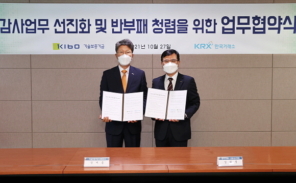 기술보증기금(기보)과 한국거래소(KRX)가 27일 본사가 위치한 부산국제금융센터(BIFC)에서 ‘감사 선진화와 반부패 청렴 업무 교류를 위한 협약’을 체결했다고 밝혔다.