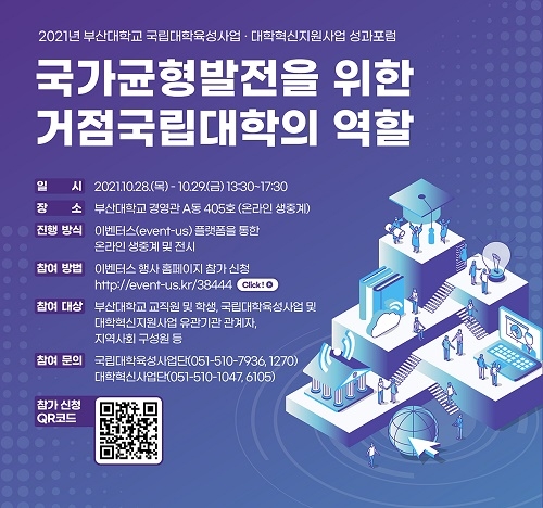 온라인 생중계로 기조강연, 우수사례 발표, 공개토론 세션과 부산대 재정지원사업의 우수성과를 한눈에 만나볼 수 있는 온라인 전시가 함께 진행된다.