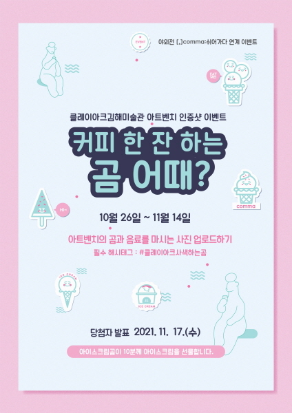 참여방법은 아트벤치의 곰과 음료를 마시는 사진을 촬영하고, 개인 인스타그램에 해시태그 ‘#클레이아크사색하는곰’과 함께 업로드하면 응모가 완료된다. 기간은 오는 11월 14일까지며 추첨을 통해 총 10명에게 아이스크림 기프티콘을 발송할 예정이다.