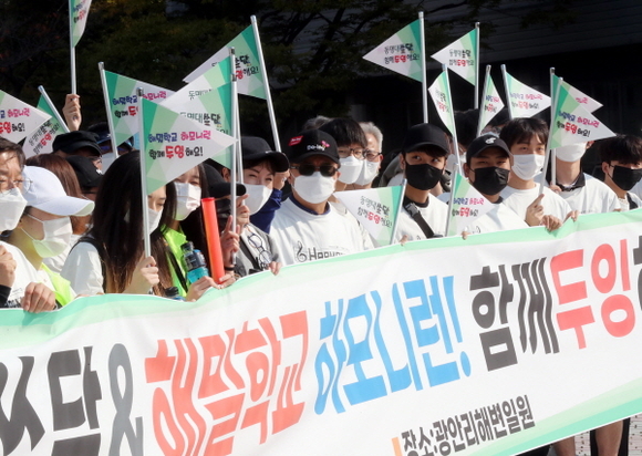 동명대는 27일 전호환 총장과 학생, 교직원 등 총 70여 명이 참여한 가운데 동명대~광안리해변 5km 구간을 걸으며 환경을 정화하는 ‘동명대쓰담&해밀학교하모니런! 함께 두잉’ 활동을 가졌다.