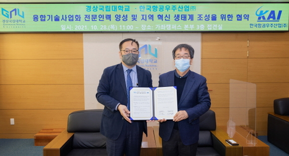 경상국립대학교(GNU)와 한국항공우주산업(주)(KAI)은 28일 오전 11시 경상국립대 가좌캠퍼스 대학본부 접견실에서 융합형 기술경영인재 양성과 경남 주력산업(기계·항공 등) 혁신 생태계 조성을 위한 업무협약을 체결했다.