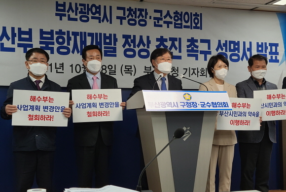 부산시 구청장·군수협의회가 28일 오후 4시 30분 부산시청 브리핑실에서 기자회견을 열고 해양수산부(해수부)에 북항 재개발 1단계 사업의 ‘정상화’를 촉구하고 나섰다.