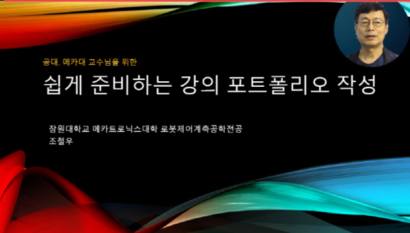 첫 번째로 창원대 e-캠퍼스에서 진행된 공학계열 맞춤형 교수법 특강은 지난 학기 티칭 포트폴리오 우수교원으로 선정된 메카트로닉스대학 전기전자제어공학부 로봇제어계측공학전공 조철우 교수가 ‘공학계열 교수님을 위한 쉽게 준비하는 강의 포트폴리오 작성’을 주제로 진행했다.