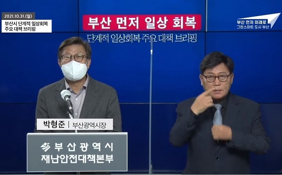 박형준 시장은 “단계적 일상 회복은 코로나19 감염병과 공존을 전제로 방역 상황을 안정적으로 관리하며 일상 회복으로 나아가는 것이다. 우리 시는 계속해서 위기 극복에 전념하며 완전한 일상 회복과 부산 경제의 재도약을 위해 최선을 다하겠다”며 “지금껏 시민 여러분의 참여와 협조 덕에 일상 회복에 한 걸음 다가설 수 있었던 것처럼 완전한 일상 회복이 이뤄질 때까진 당분간 마스크 쓰기와 같은 기본 방역수칙을 철저히 지켜 달라. 또 다음 단계의 방역 완화를 위해선 예방 접종률이 매우 중요한 만큼 아직 접종하지 않은 시민께서는 적극 참여해주시기 바란다”고 당부했다.