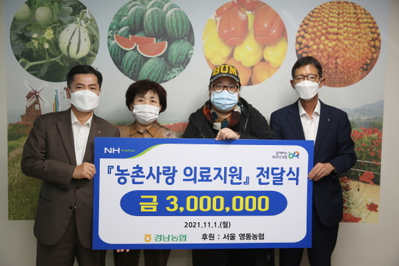 농협은 2012년부터 서울 영동농협의 후원을 받아 (사)농촌사랑범국민운동본부 주관으로 희귀·난치 질환으로 어려움을 겪는 농촌지역 아동을 대상으로 매년 의료지원금을 지원하고 있다. 올해는 경남지역 12명의 환아를 대상으로 1인당 300만원, 총 3600만원의 진료비와 생계지원비를 지원했다.